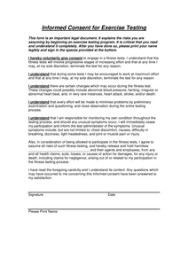 Informed Consent for Exercise Testing This form is an important legal document. It explains the risks you are assuming by beginning an exercise testing program. ... Document Retrieval
